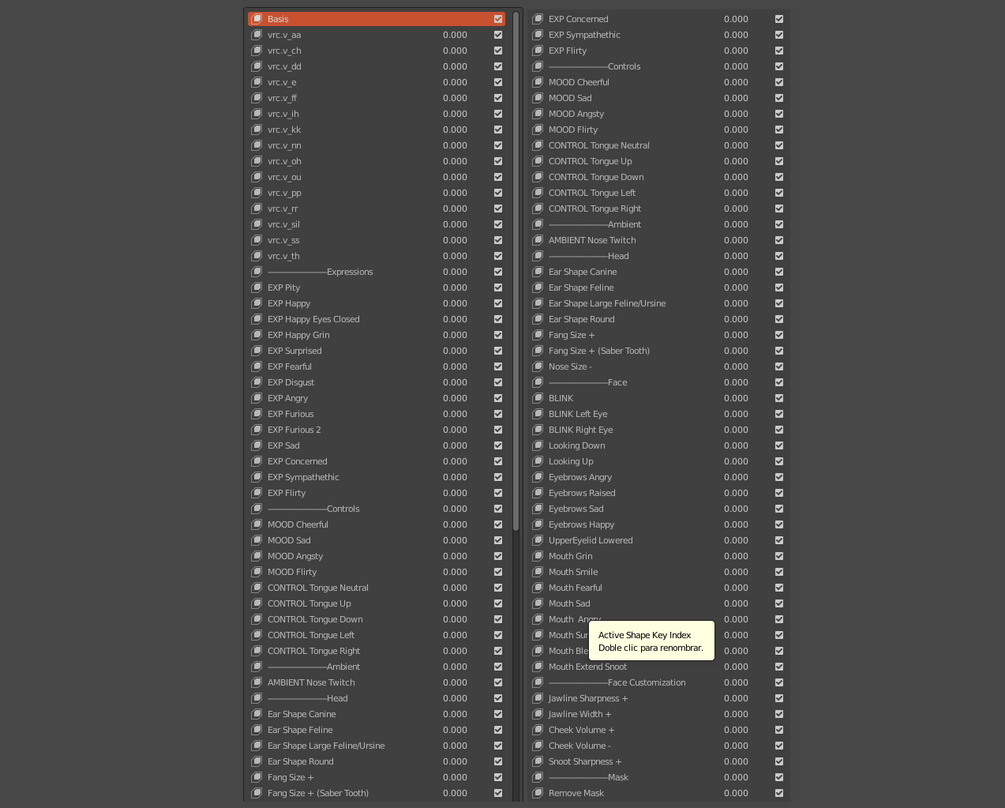 - All head shapekeys (Visemes, EXP, MOOD, Control).
